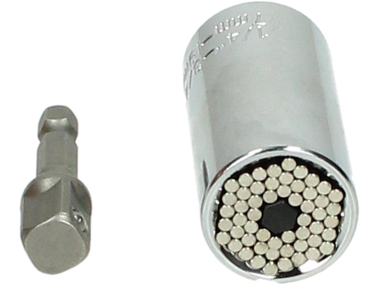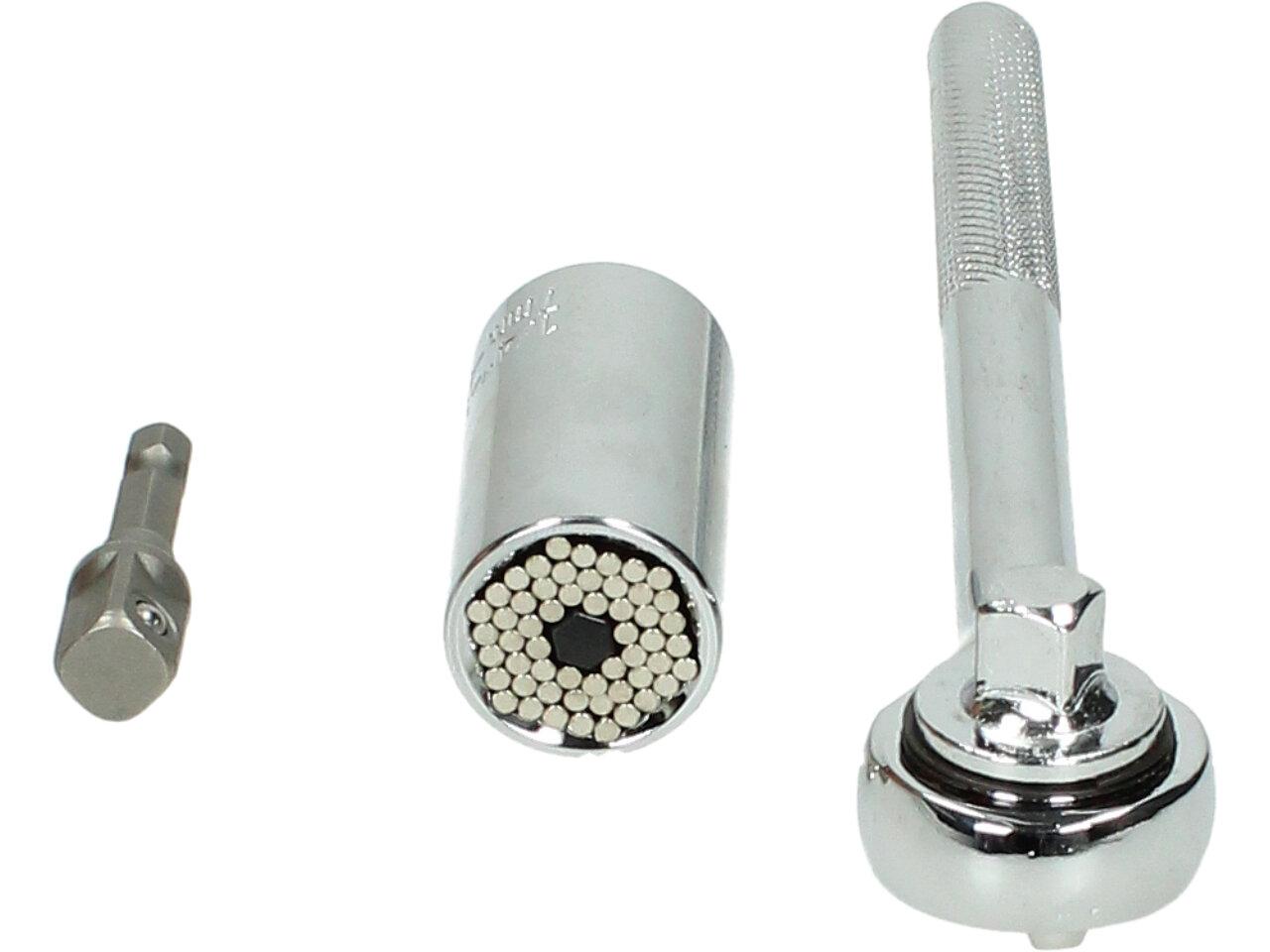 Univerzální nástrčná hlavice s ráčnou nahrazuje čtyř nebo vícehranné nástrčné hlavice. Není potřeba kupovat a skladovat sadu hlavic! Univerzální nástrčnou hlavici lze použít i na atypické tvary (skoby, křídlové matice, očka). Univerzální hlavice je vhodná na montáž šroubů s šestihrannou hlavou o velikosti 7 až 19 mm. Univerzální hlavice umí dotáhnout nebo povolit i šrouby s čtvercovou hlavou, osmihrannou hlavou, křídlové matice, oka a háky na šroubu atd. Neocenitelná je taky možnost povolit šrouby, ventily a další zařízení s poškozeným povrchem, které nelze již povolit standardními klíči. Nástrčnou hlavici lze nasadit na ráčnu 1/2 palce nebo přes redukci na aku šroubovák