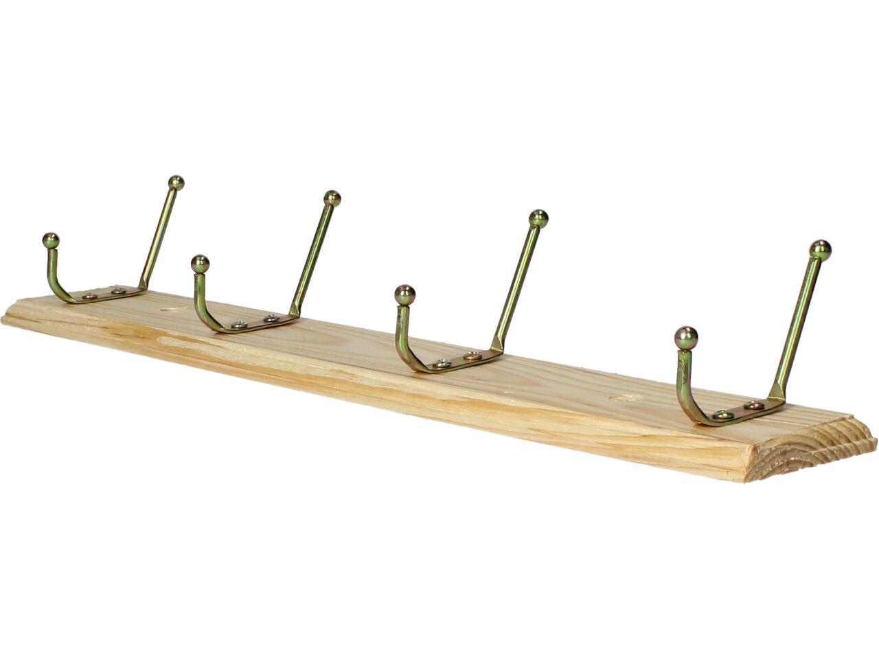 Dřevěná opracovaná lišta ze smrkového dřeva se třemi kovovými věšáky, každý se dvěma poutky, ve zlaté barvě je decentní, vkusný a malý věšák. Na těle má již dva předvrtané otvory na šrouby k přichycení na stěnu či dvěře. Instalace je jednoduchá, součástí balení jsou i dvě hmoždinky a šroubky pro přichycení. Tento věšák najde své uzplatnění nejen doma na předsíni, ale i v koupleně, v kuchyn, dílně, garáži atd.