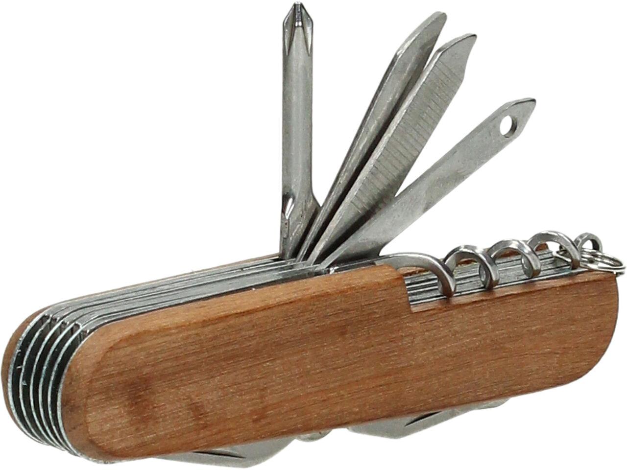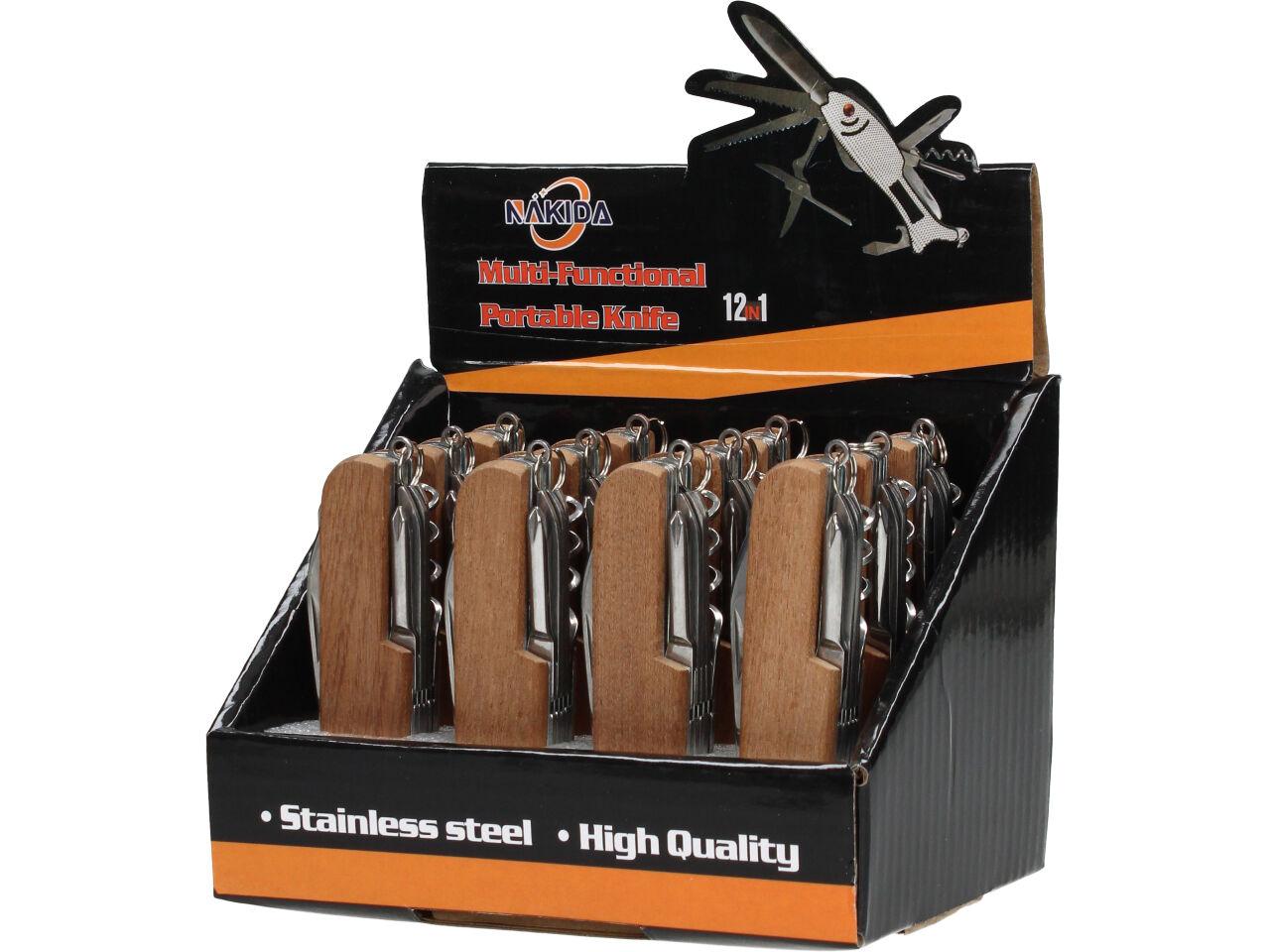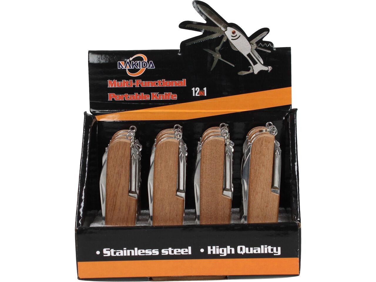 Objevte všestrannost a praktičnost s naším kapesním rozkládacím nožem 12v1 v elegantním designu s dřevěnou střenkou. Tento multifunkční nástroj kombinuje 12 specifikací, včetně otvíráku na konzervy, otvíráku na pivo, pily, nůžek, křížového šroubováku, otvíráku na víno, pilníku a dvojité pily, což ho činí ideálním společníkem pro různé situace.