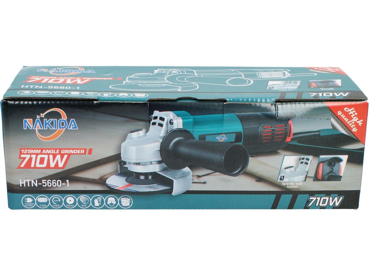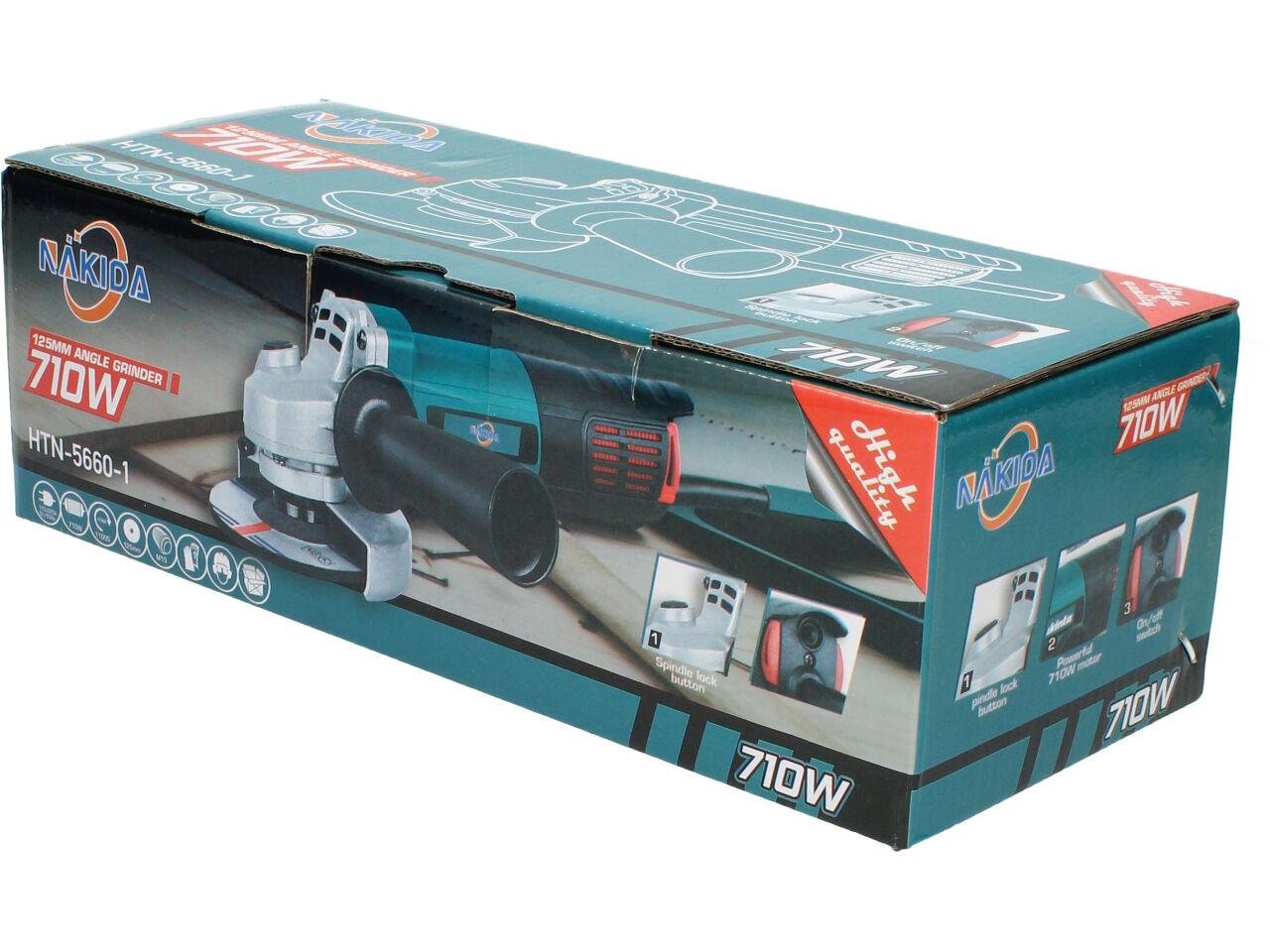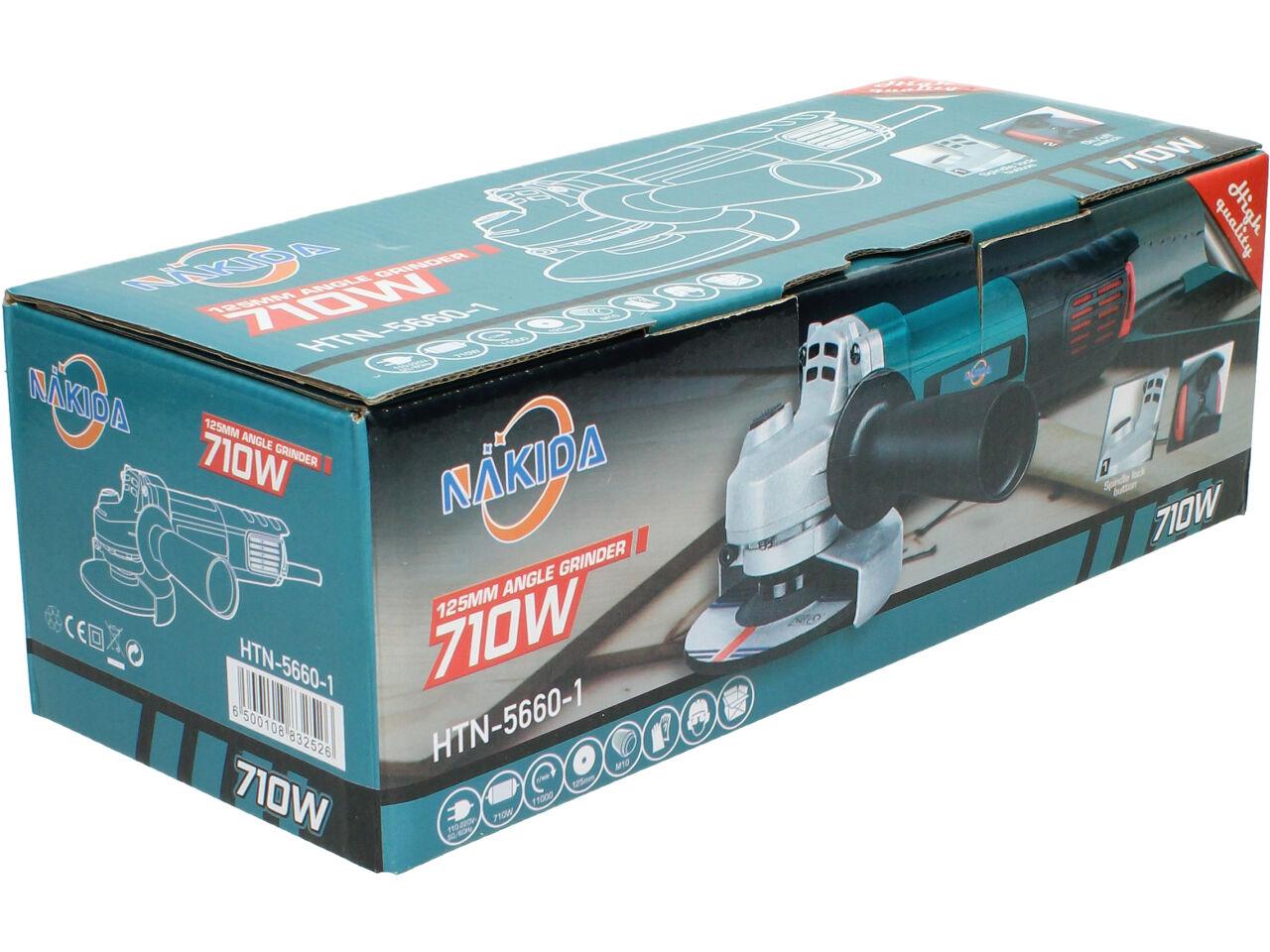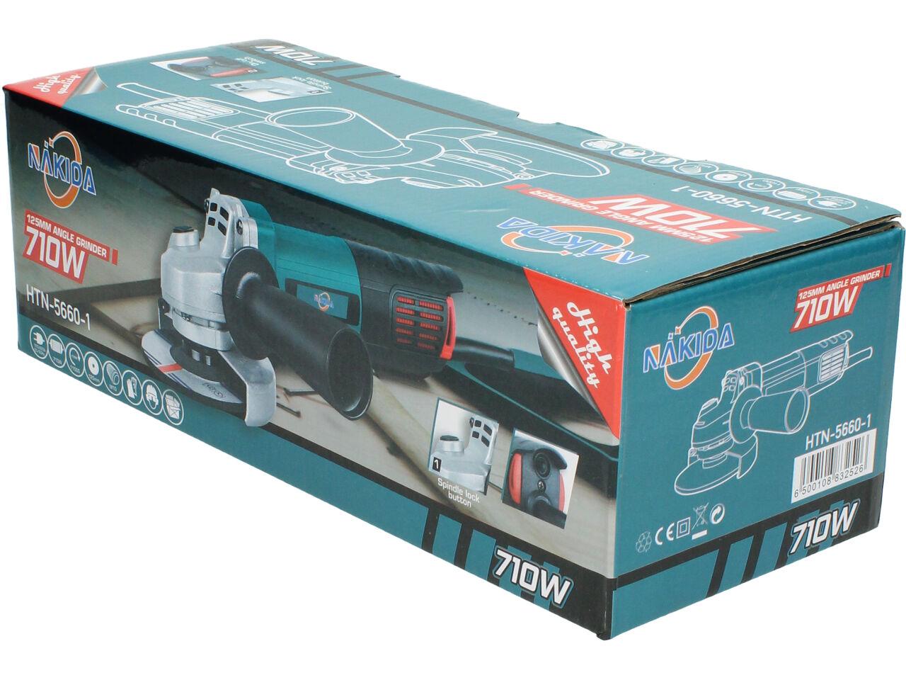 Nakida® Úhlová bruska 125mm 710W HTN-5660-1 s nastavitelným ochranným krytem a robusním držadlem s vysunovací mřížkou a ochranou motoru proti nešistotám. Bruska je dodávána s brusným kotoučem a náhradními uhlíky.