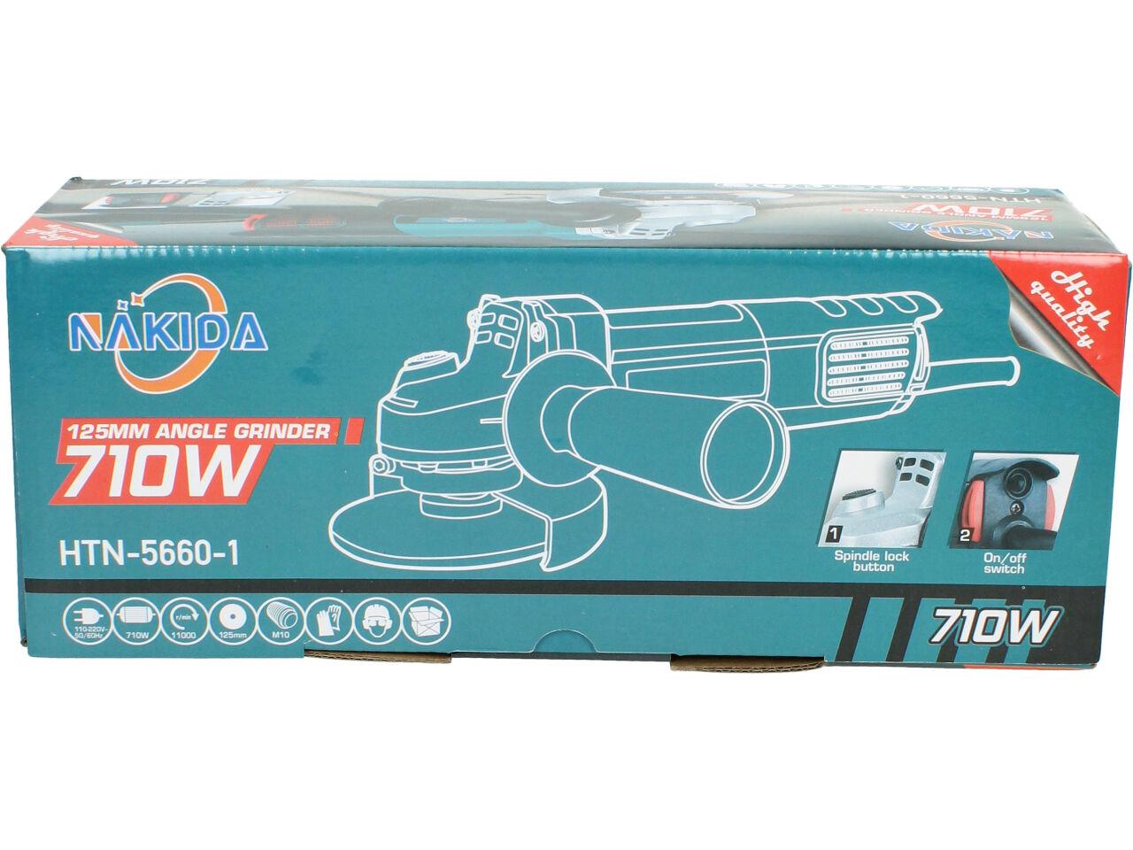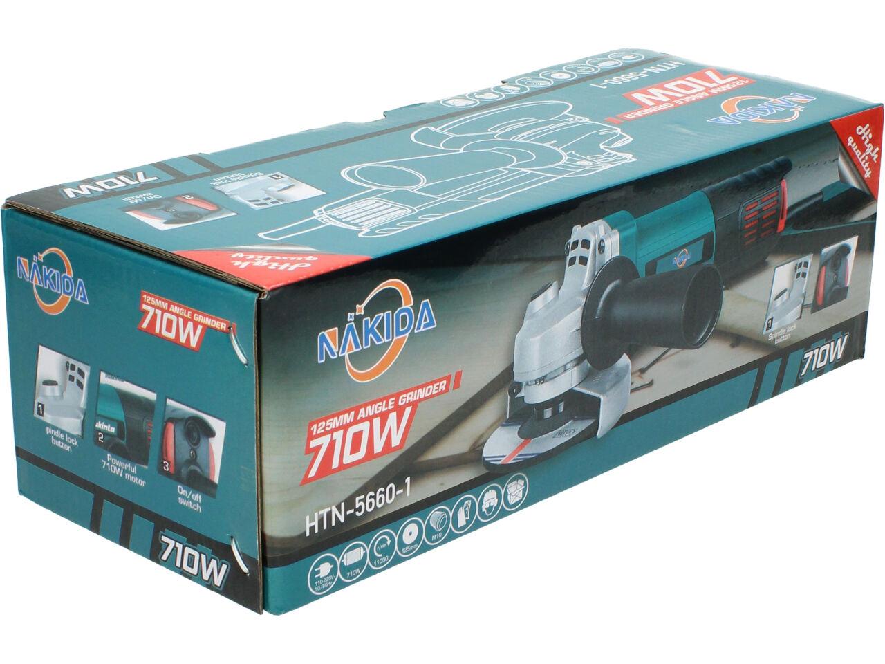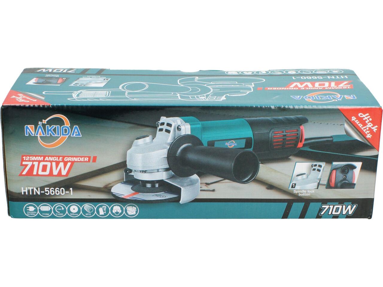 Nakida® Úhlová bruska 125mm 710W HTN-5660-1 s nastavitelným ochranným krytem a robusním držadlem s vysunovací mřížkou a ochranou motoru proti nešistotám. Bruska je dodávána s brusným kotoučem a náhradními uhlíky.