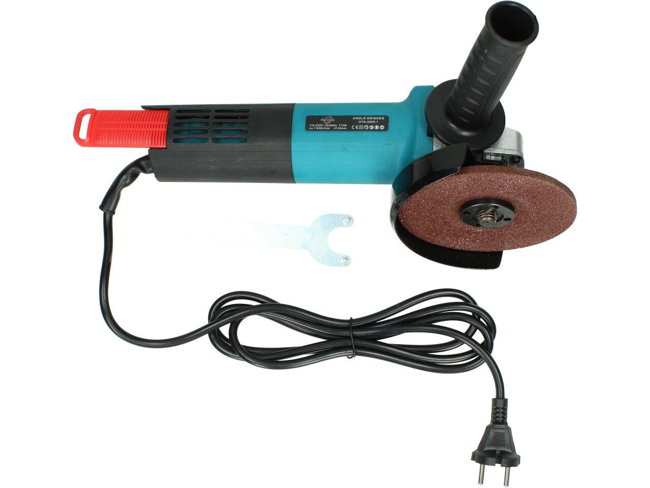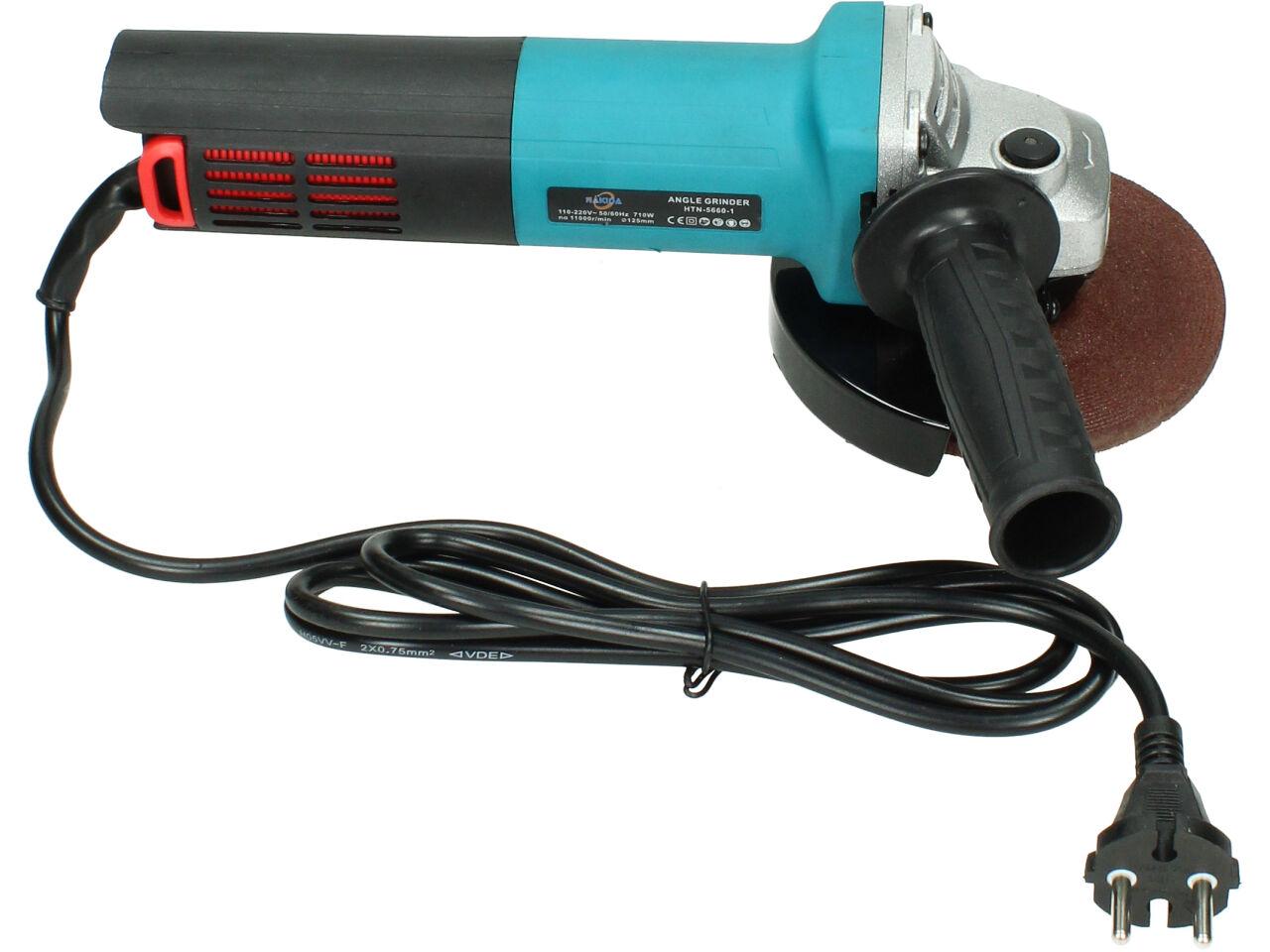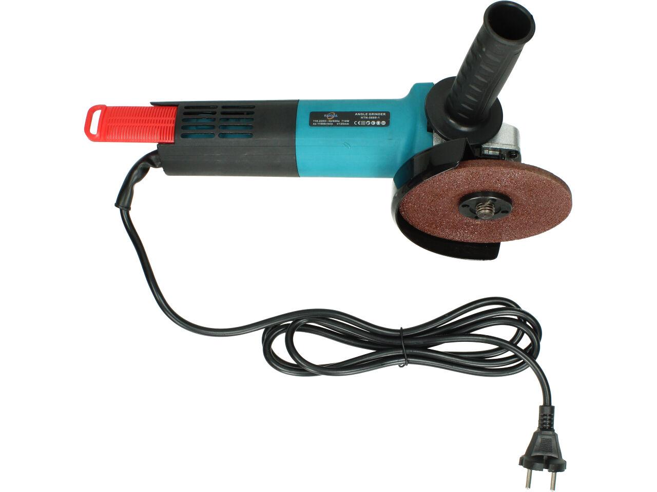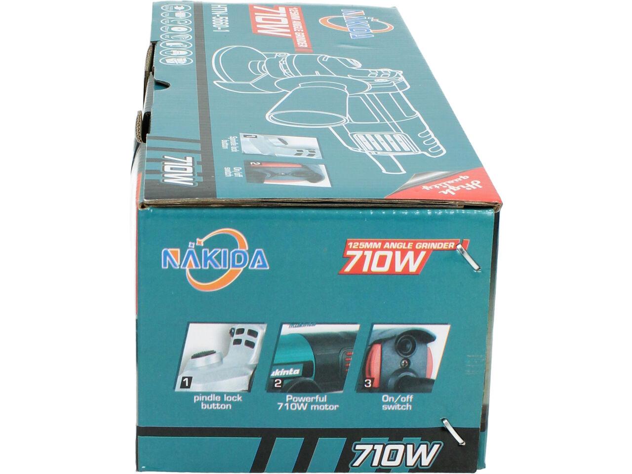 Nakida® Úhlová bruska 125mm 710W HTN-5660-1 s nastavitelným ochranným krytem a robusním držadlem s vysunovací mřížkou a ochranou motoru proti nešistotám. Bruska je dodávána s brusným kotoučem a náhradními uhlíky.