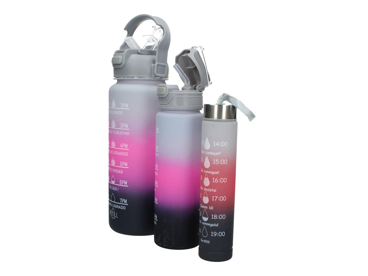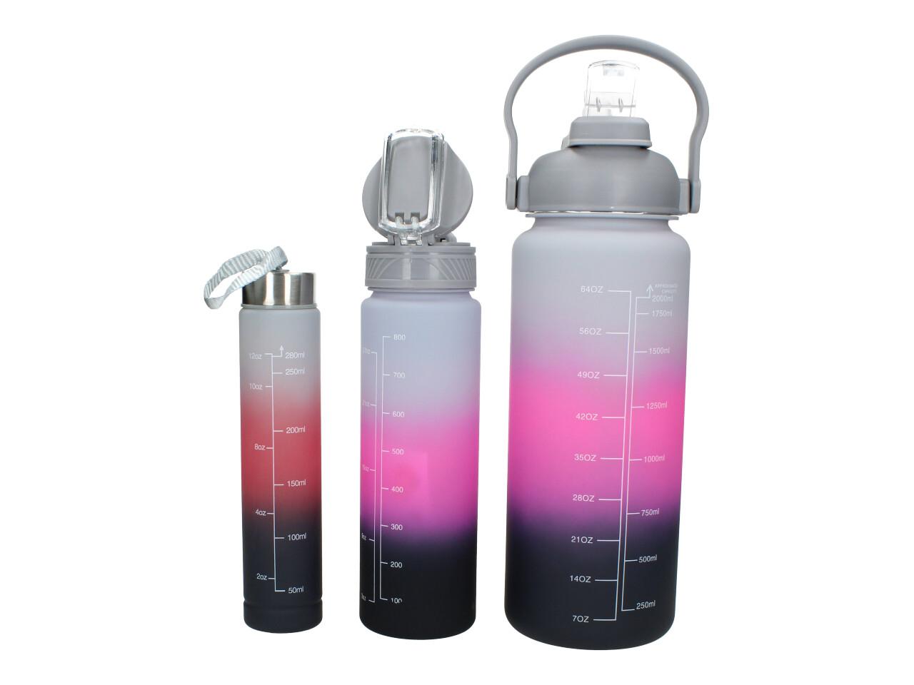 Každá z lahví má odměrku, která ukazuje, kolik vody bylo vypité. Přijměte výzvu k lepšímu zdraví!