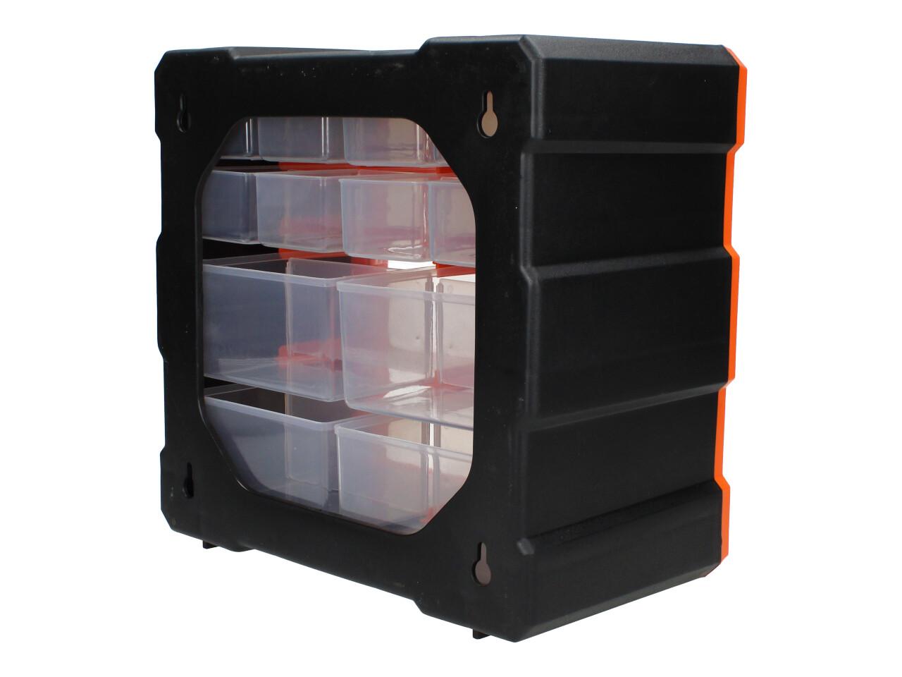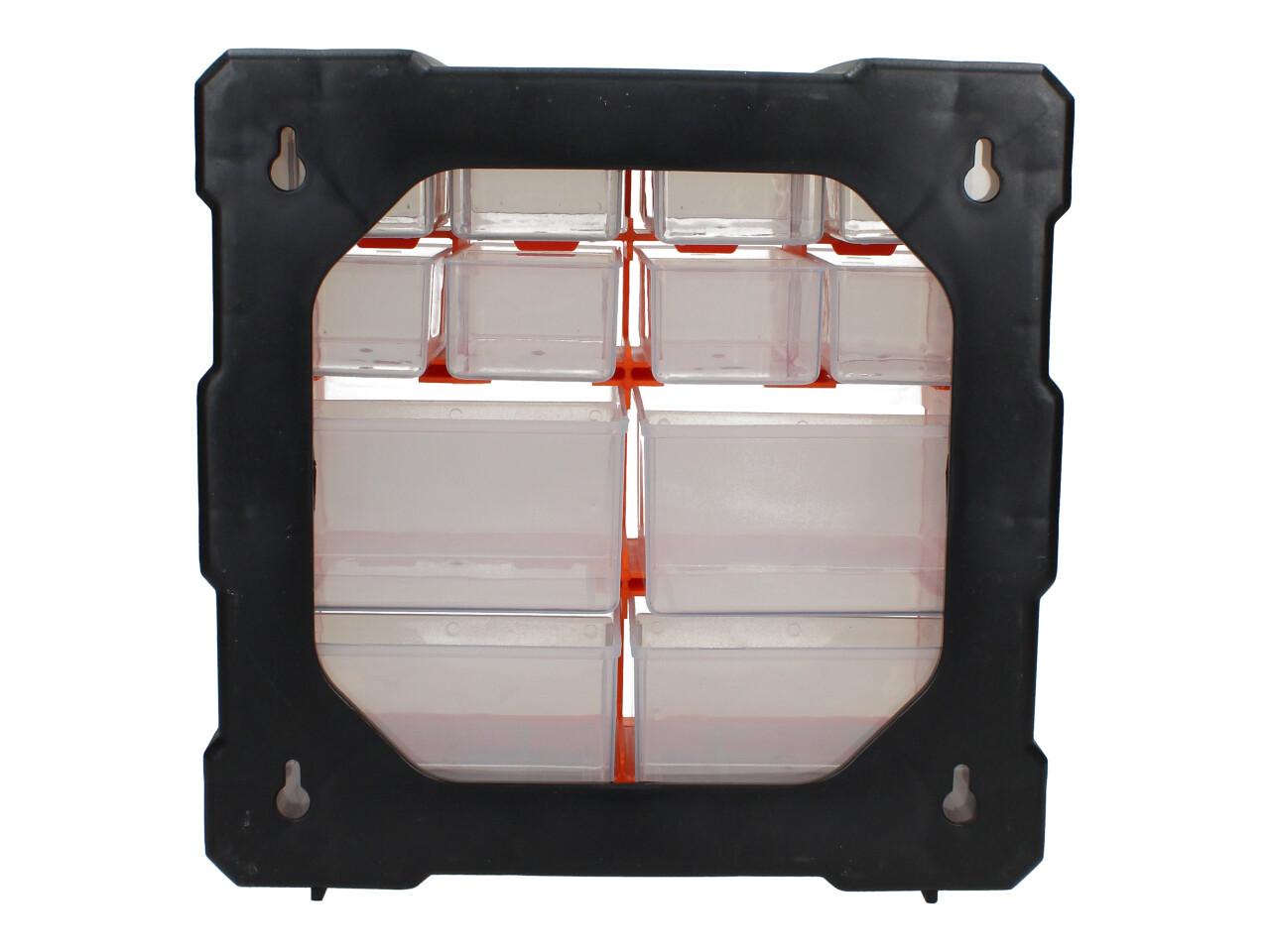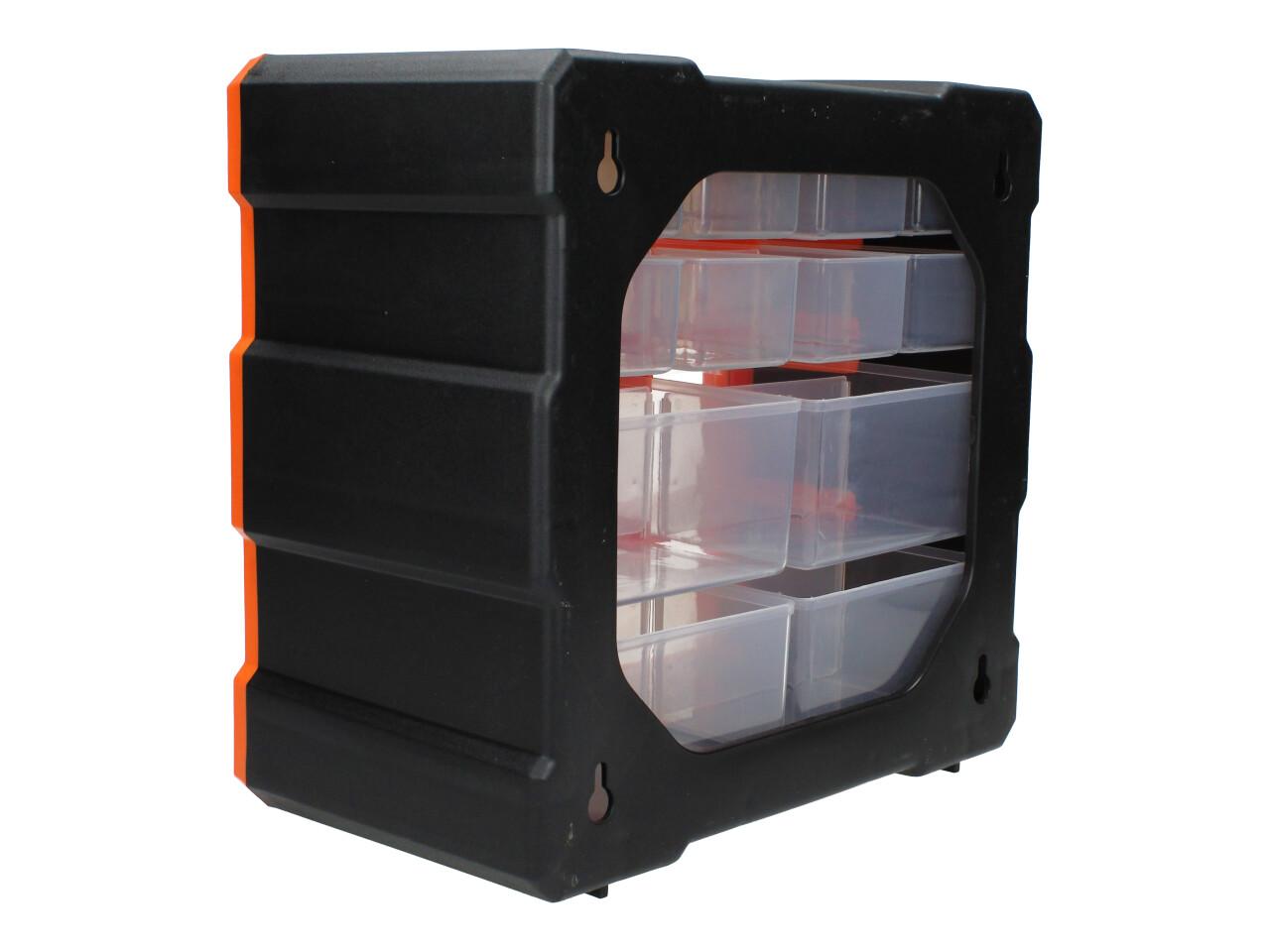 Praktický úložný box z odolného plastu. Organizér je možné zavěsit na zeď pomocí otvorů pro šrouby na zadní straně boxu.