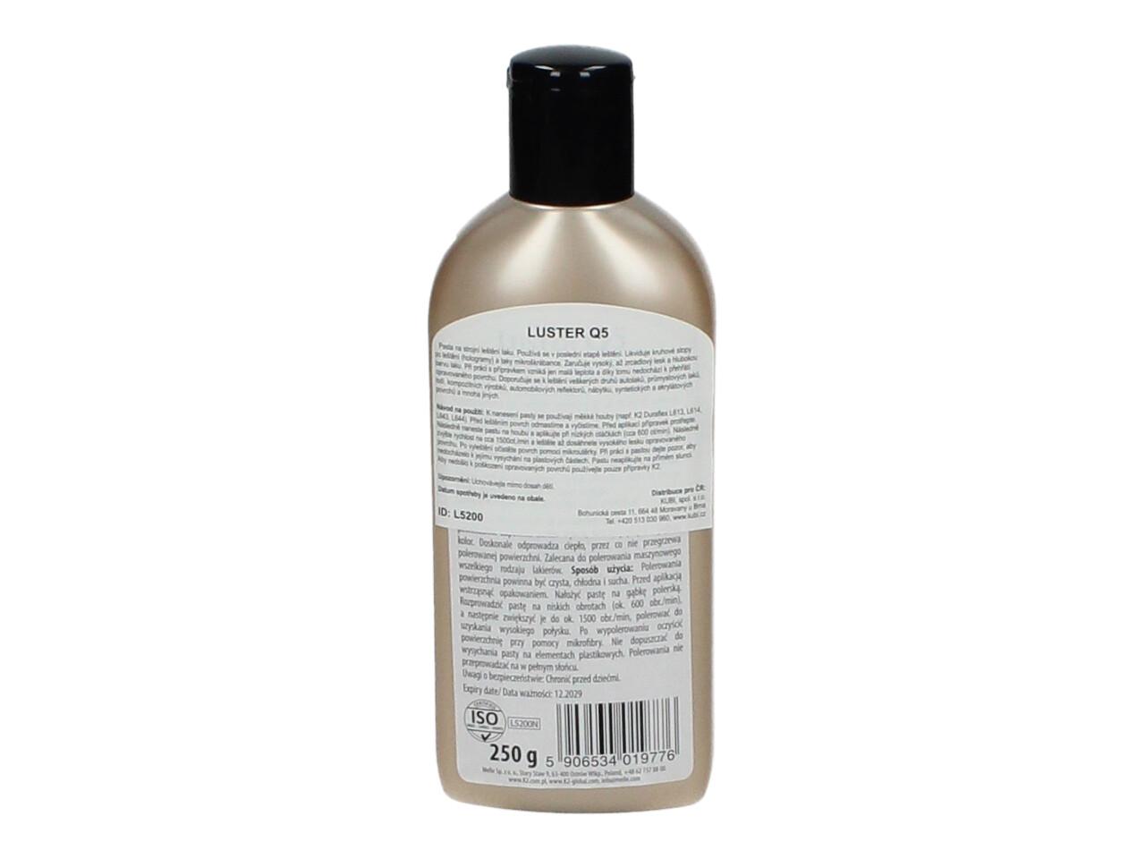 K2 Luster Q5 Blue 250 g je finišovací leštící pasta určená pro poslední krok strojního leštění laků a dalších povrchů. Odstraňuje hologramy, kruhové stopy po leštění a mikroškrábance, čímž zajišťuje zrcadlový lesk a intenzivní barvu. Díky nízké tvorbě tepla je bezpečná pro všechny typy automobilových i průmyslových laků.
