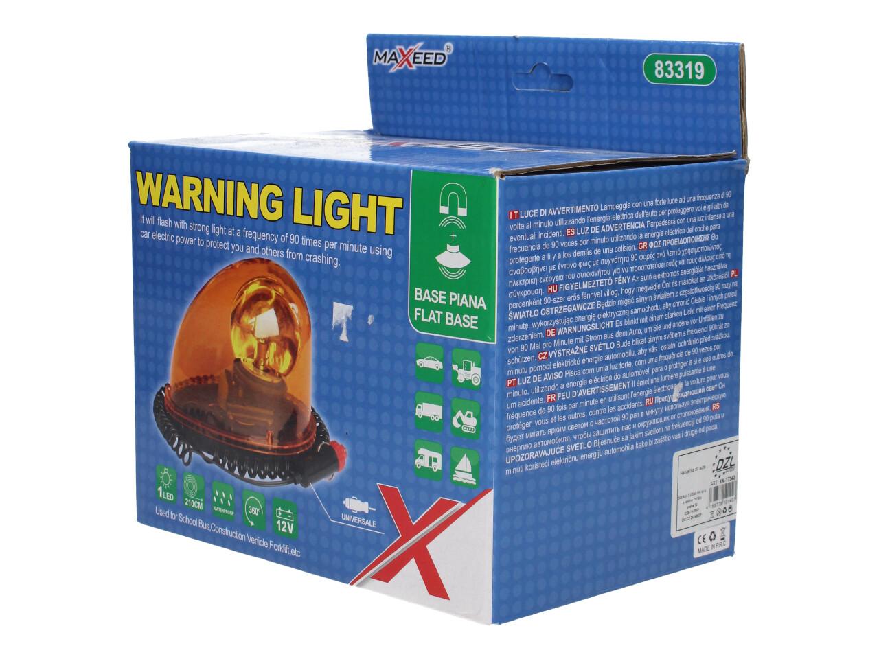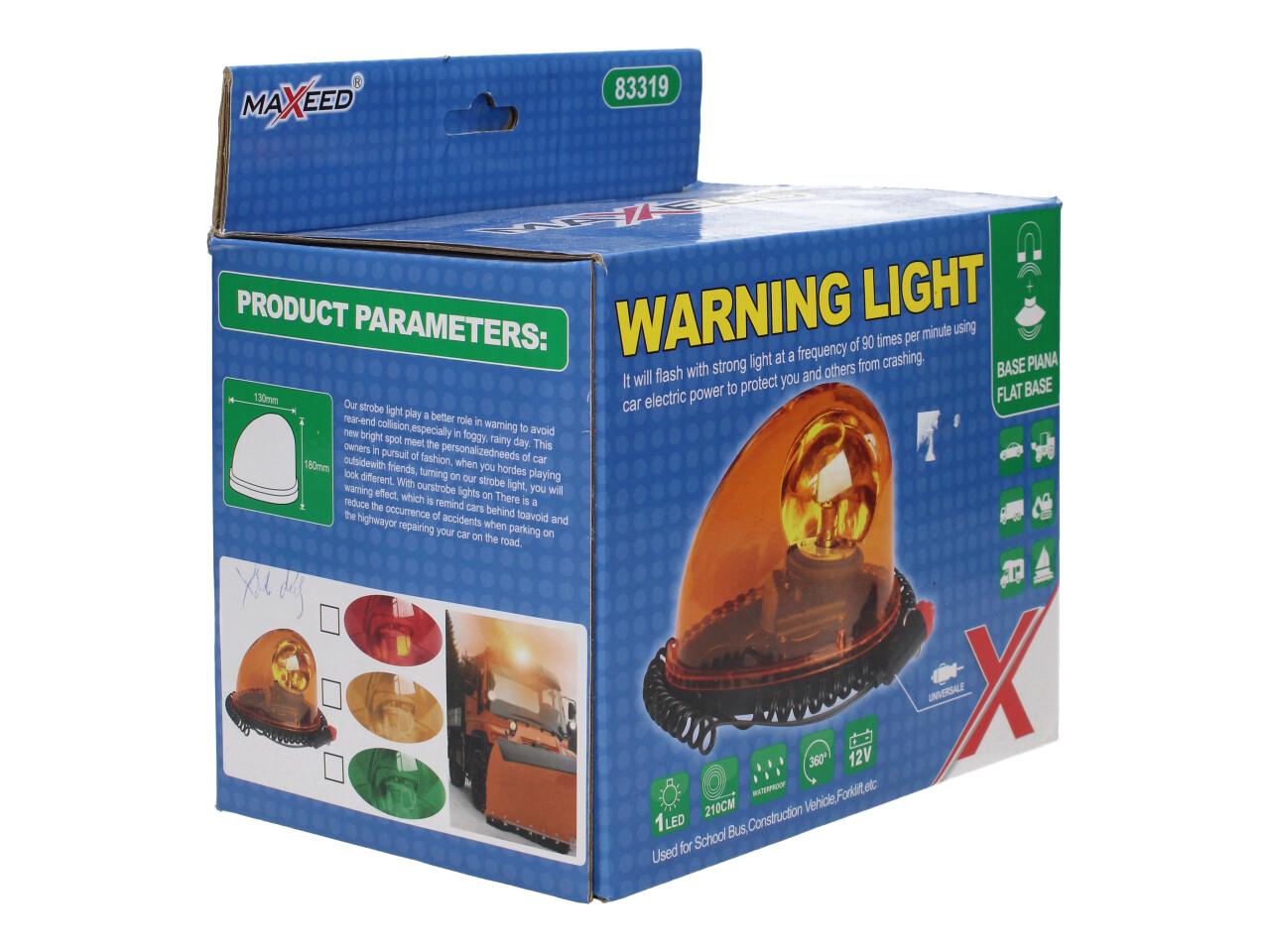 Výstražný oranžový maják Maxeed 83319 je praktické bezpečnostní světlo pro vozidla, stroje nebo pracovní techniku. Napájí se jednoduše přes 12V autozapalovač a díky magnetické základně jej rychle upevníte na střechu nebo jiný kovový povrch. Maják je vodotěsný a zajišťuje dobrou viditelnost ze všech stran díky 360° rotaci.